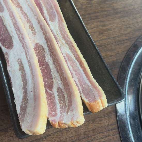 Cut exceptionally thick for meatiness — about 3–5 pieces per pound — this is a true steakhouse-style bacon with real weight and structure. Slow-cured, naturally smoked with hickory wood, and designed to be eaten with a knife and fork. This is a really delicious bacon unique to Pursuitfarms.